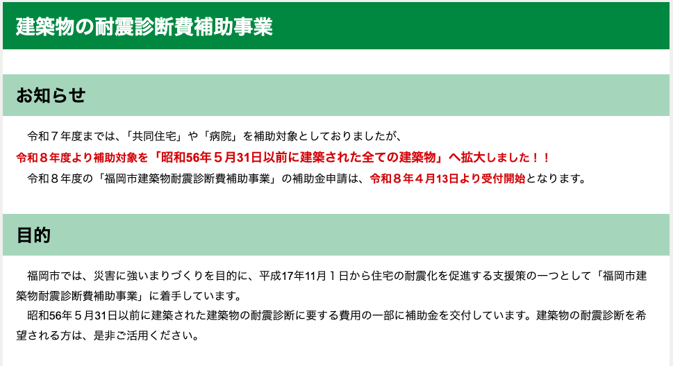 1981年(昭和56年)以前に建てられた旧耐震基準の戸建てには、市区町村の耐震診断・耐震改修補助が使えるばい。