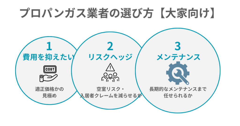 • プロパン会社を替えるなら、そのタイミングで給湯器も一緒に替えると、費用とランニングコストの両方で得しやすいです。