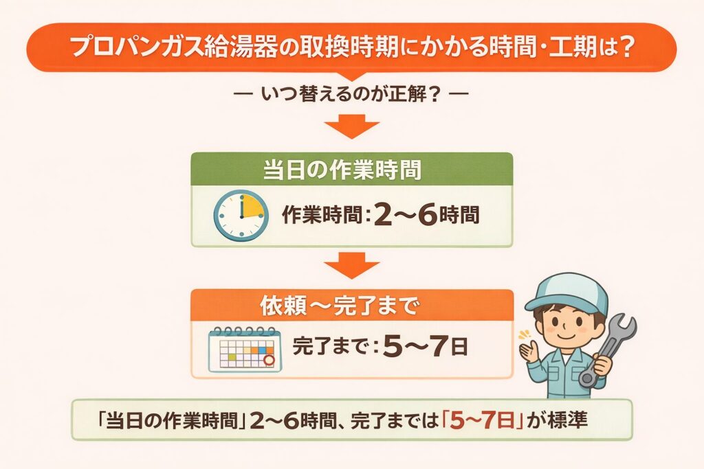 プロパンガス給湯器の場合も、設置から10〜15年が交換検討ゾーンとされ、10年を超えたら「いつ壊れてもおかしくない」状態。
