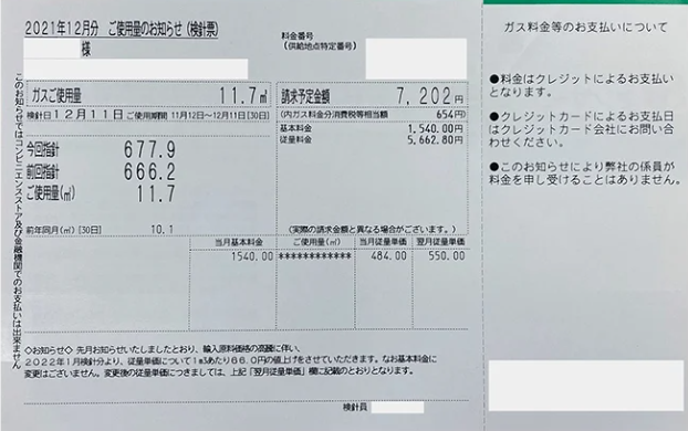 • ガス料金(税抜)= 基本料金 +(従量単価 × 使用量[m³])