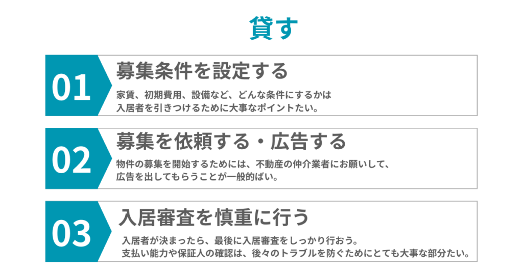 物件のリフォームが終わったら、いよいよ「貸す」ステップばい!ここでは、募集条件を決めたり、仲介業者に依頼して広告を出したり、入居者審査を慎重に行ったりすることが大事やけん、しっかり確認しよう!
